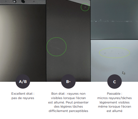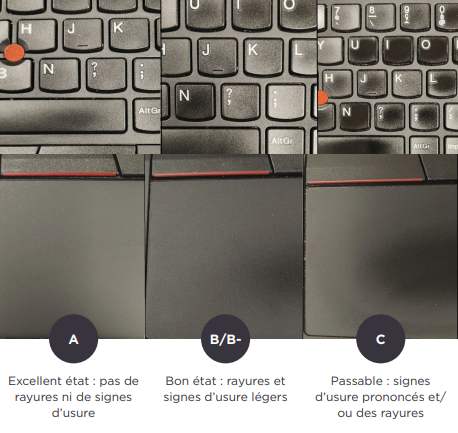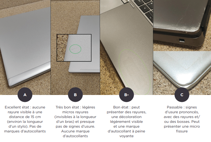 Tous nos PC portables sont réceptionnés et audités dans nos locaux à Lunel-Viel (Hérault, 34). A l'issue de chaque audit, nous attribuons un grade, qui reprend uniquement des caractéristiques esthétiques et qui sont répertoriées de la façon suivante :